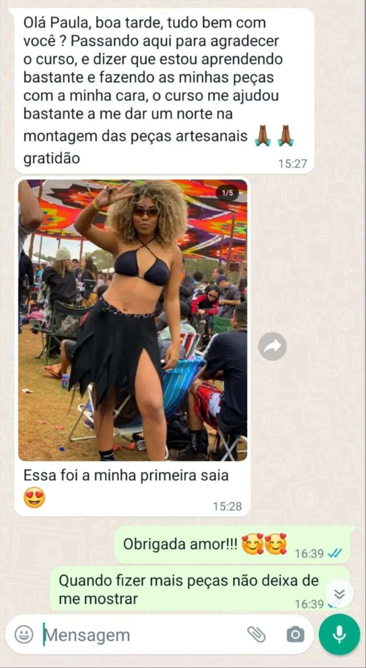 Olá, meu nome é Paula. Desde que participei do meu primeiro festival, fiquei encantada com esse universo. Foi ali, no meio daquela energia, que descobri minha paixão por criar roupas artesanais únicas e confortáveis pra esse tipo de evento.